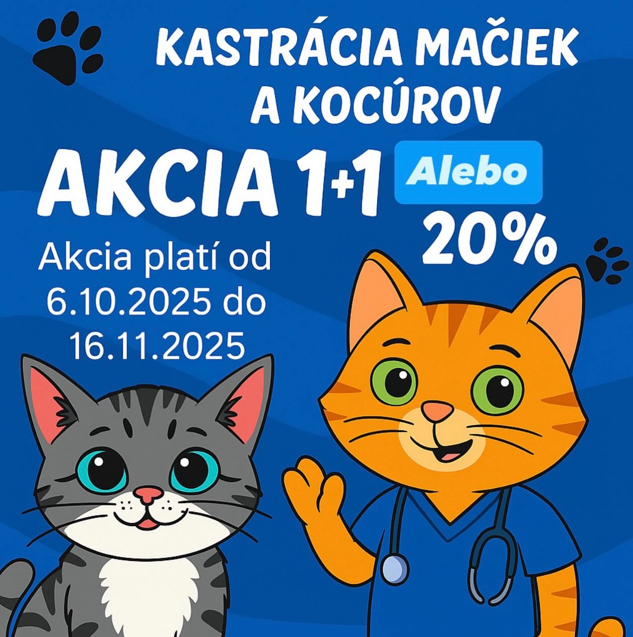 bude prebiehať kastrácia mačiek a kocúrov v akcií 1+1 alebo 20% pri jednom zvieratku.